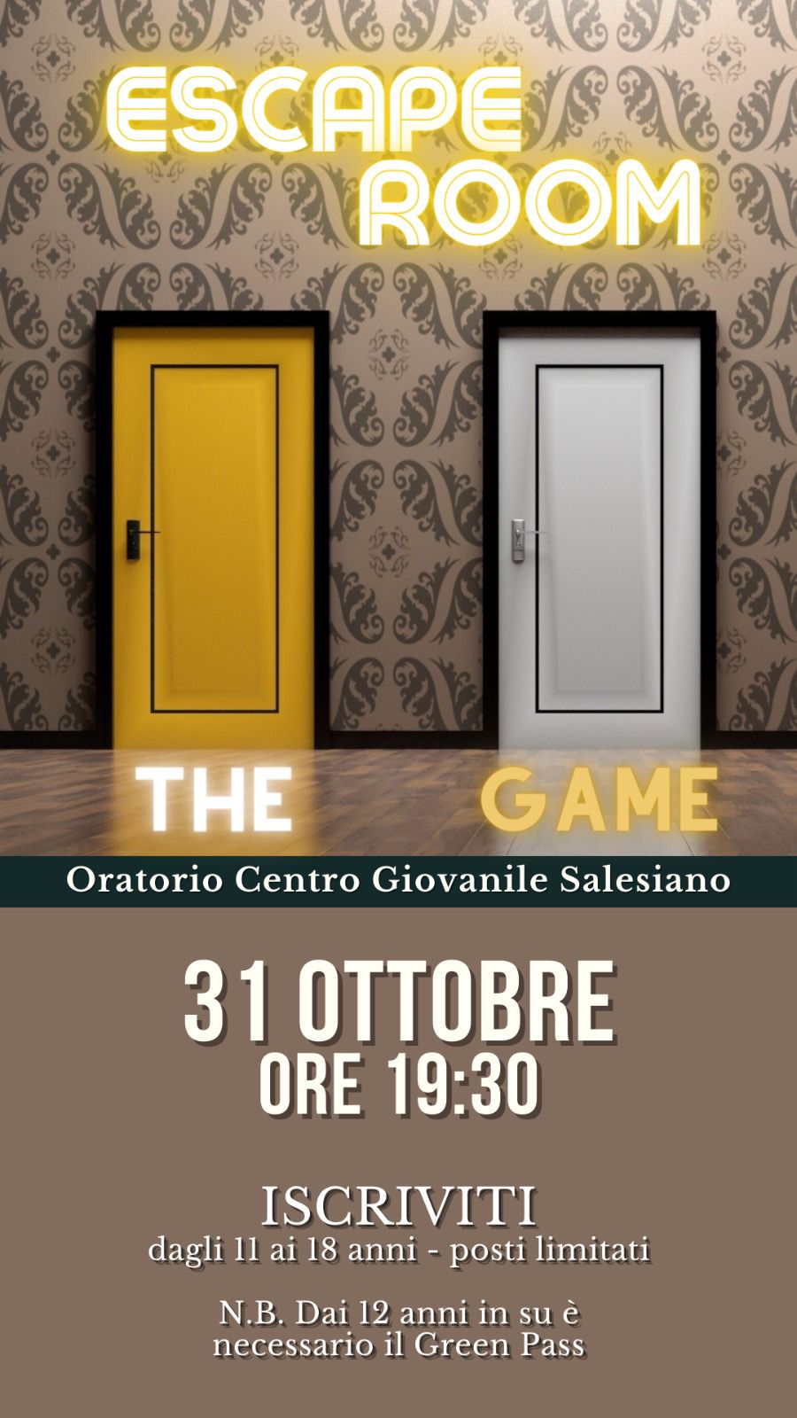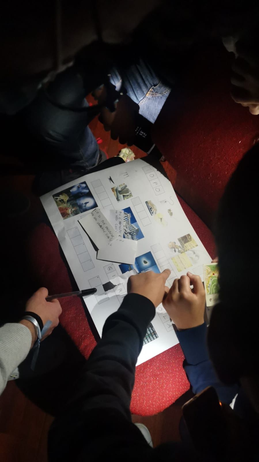 Al termine della cena i rispettivi partecipanti, dopo essere stati divisi nelle 5 squadre, hanno ricevuto un sms riguardante un video, che spiegava l’avvenuto sequestro di un animatore. Così, ha avuto inizio il gioco dell’Escape Room, un’ambientazione fantastica impregnata di thriller e suspence che, nel tempo di due ore e mezza ha dato vita ad una ricerca forsennata contro il tempo. Per terminare il gioco era necessario risolvere 8 diversi enigmi situati in 8 differenti stanze dell’oratorio. Al termine di ogni rompicapo si riceveva un codice criptato che, unito agli altri, permetteva di aprire un cryptex contenente la chiave per liberare l’ostaggio.